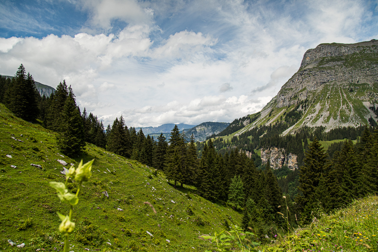 So besteigen wir also zu Hause den Bus nach Luzern und fahren dann mit dem Voralpenexpress dem Vierwaldstättersee, dem Zugersee und dem Lauerzersee entlang nach Schwyz. Nach zwei weiteren Busfahrten und fast drei Stunden haben wir unser Ziel, die Haltestelle „Schlänggen“ im Nirgendwo des Bisistals, erreicht. Über blühende Alpweiden steigen wir hoch, Wolken umhüllen die Gipfel der Schwyzer Voralpen. Auf einer Alp legen wir eine Pause ein, hören Murmeltiere und erblicken irgendwelche Hühnervögel, können sie aber nicht bestimmen. Wir denken, dass es vom Ort her am ehesten Birkhühner sein könnten. Kurz darauf fragen wir den Älpler, der vor der nahen Alphütte jeweils kurz mit den Wanderern plaudert. Er hat aber keine Ahnung, ob es hier Birkhühner gibt.