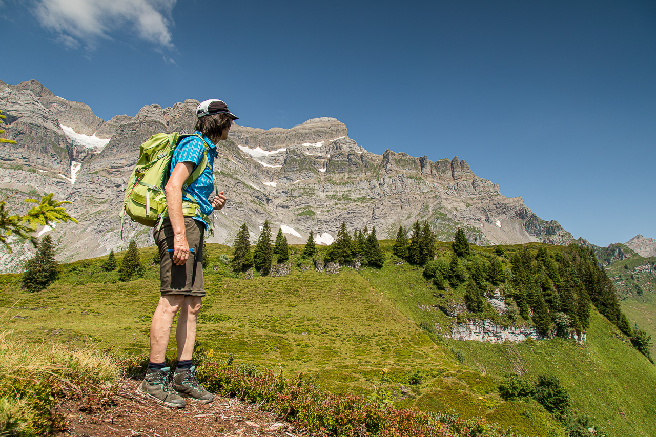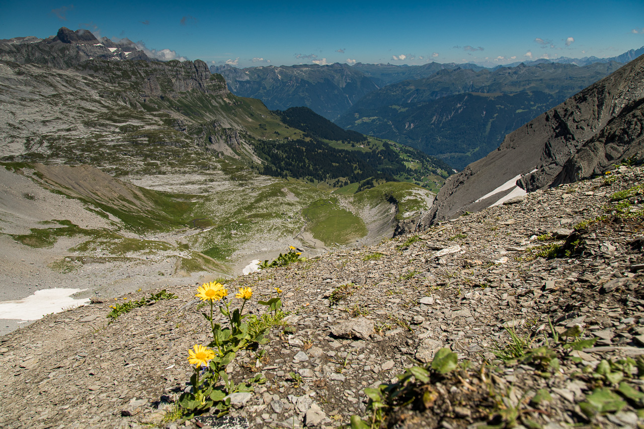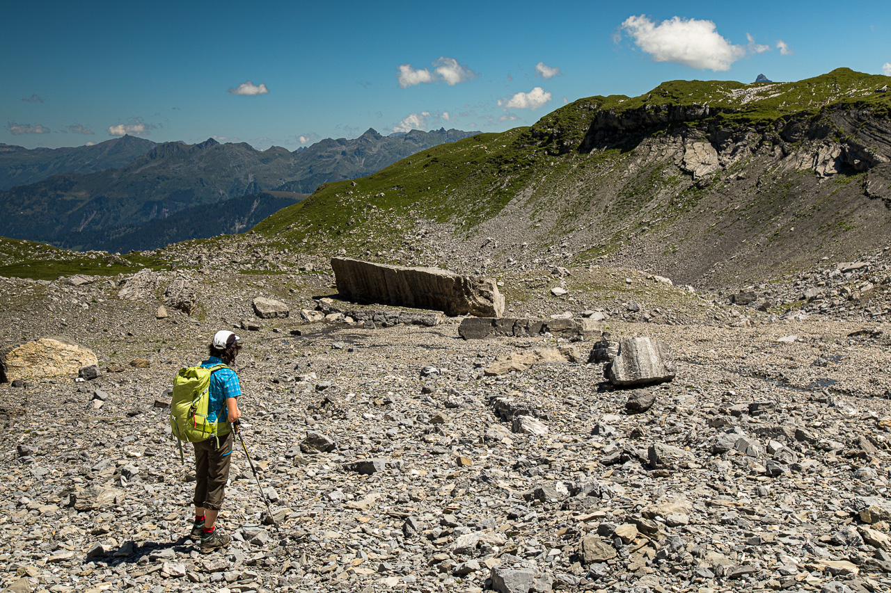 Der Ortstock, der Hausberg von Braunwald, wäre nicht mehr fern, aber da wir vom Tal aus gestartet sind, lassen wir den aus, wir haben in dieser Woche ja noch mehr vor. Der letzte Teil vor dem Pass ist mühsames Geröll: Zwei Schritte vorwärts, einer zurück. Wir erreichen die Furggele, machen Pause und geniessen die Aussicht. Wir lassen unsere Blicke schweifen auf Braunwald und ins Glarnerland, auf die andere Seite in die Schwyzer und Urner Alpen.