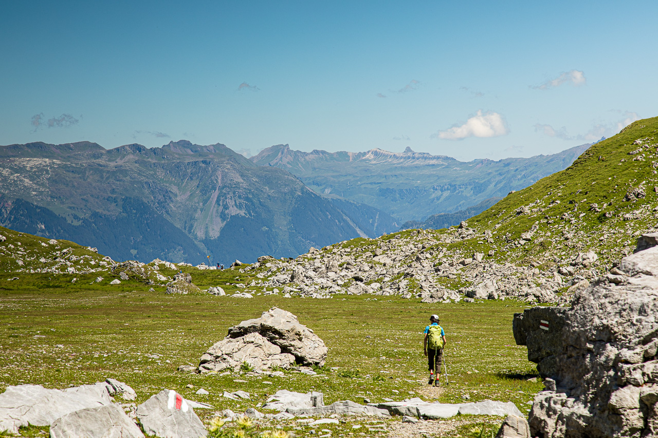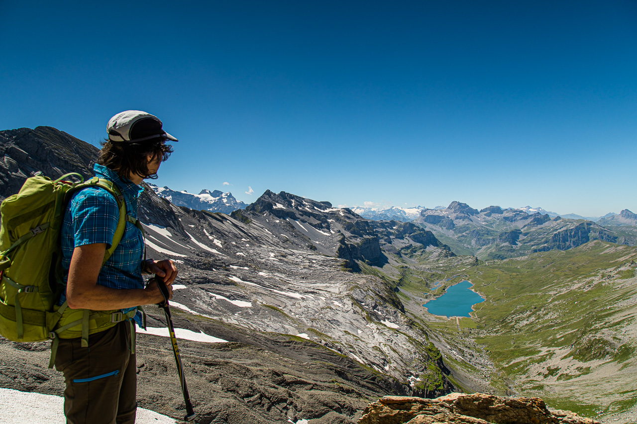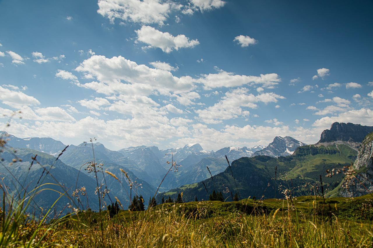 Der Ortstock, der Hausberg von Braunwald, wäre nicht mehr fern, aber da wir vom Tal aus gestartet sind, lassen wir den aus, wir haben in dieser Woche ja noch mehr vor. Der letzte Teil vor dem Pass ist mühsames Geröll: Zwei Schritte vorwärts, einer zurück. Wir erreichen die Furggele, machen Pause und geniessen die Aussicht. Wir lassen unsere Blicke schweifen auf Braunwald und ins Glarnerland, auf die andere Seite in die Schwyzer und Urner Alpen.
