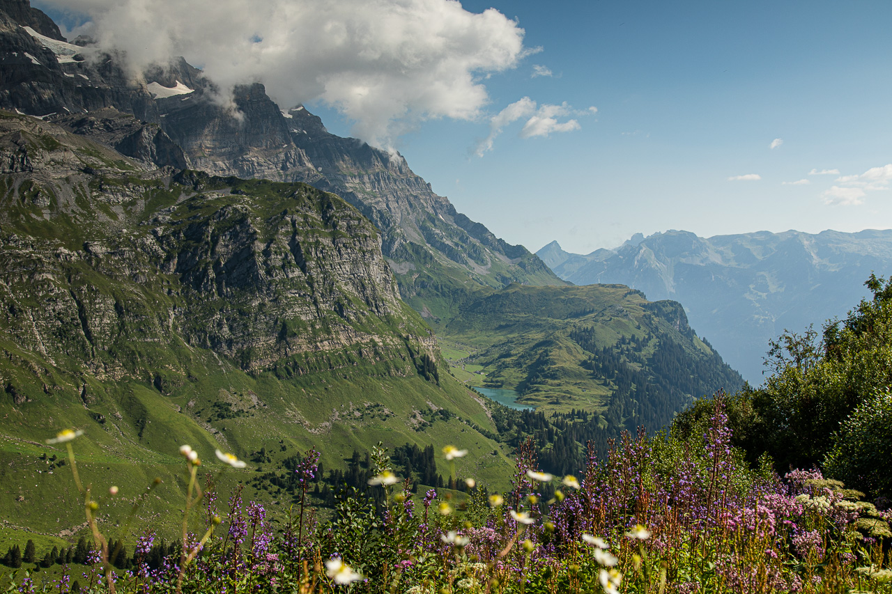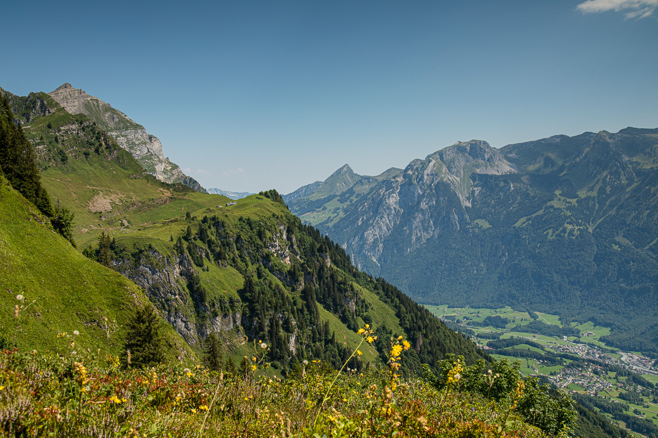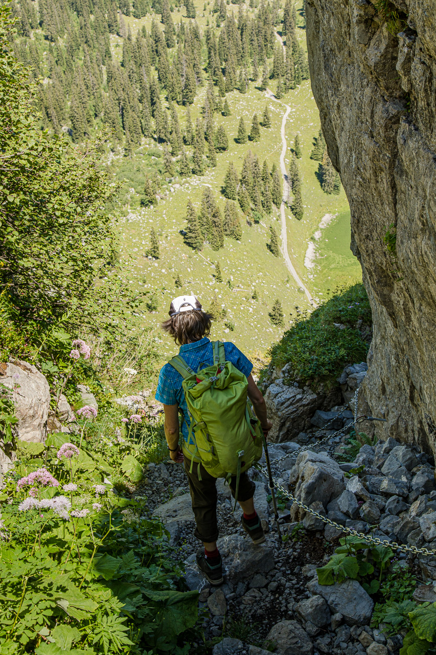 Nun haben wir die Wahl: Nach links auf einem Bergweg nach Gumen und mit der Bahn runter oder direkt via Bärentritt nach Braunwald. Ich habe keine Ahnung, was der Bärentritt ist, aber direkt runter ist sicher schneller. Zu Beginn geht es noch normal abwärts, dann wird es immer steiler, dann kommen Ketten. Wir steigen einfach ab, ohne genauer zu schauen. Wir ahnen, dass es da runter geht, sehen tun wir das aber nicht genau. Irgendwann wird das Gelände flacher und geht in Wiese über. Gemütlich flanieren wir zwischen Blumen, schauen zurück: Wir sind eine fast senkrechte Felswand abgestiegen! Von der Brächalp führt der Weg nochmals steil abwärts, bevor wir Braunwald und unser Hotel erreichen. Zum Glück, unsere Trinkvorräte sind erschöpft und wir haben Durst. Jetzt etwas trinken!