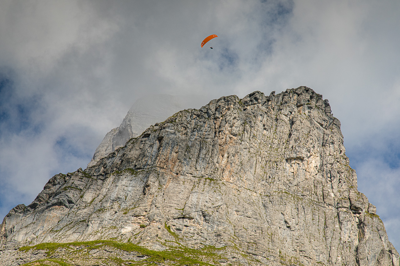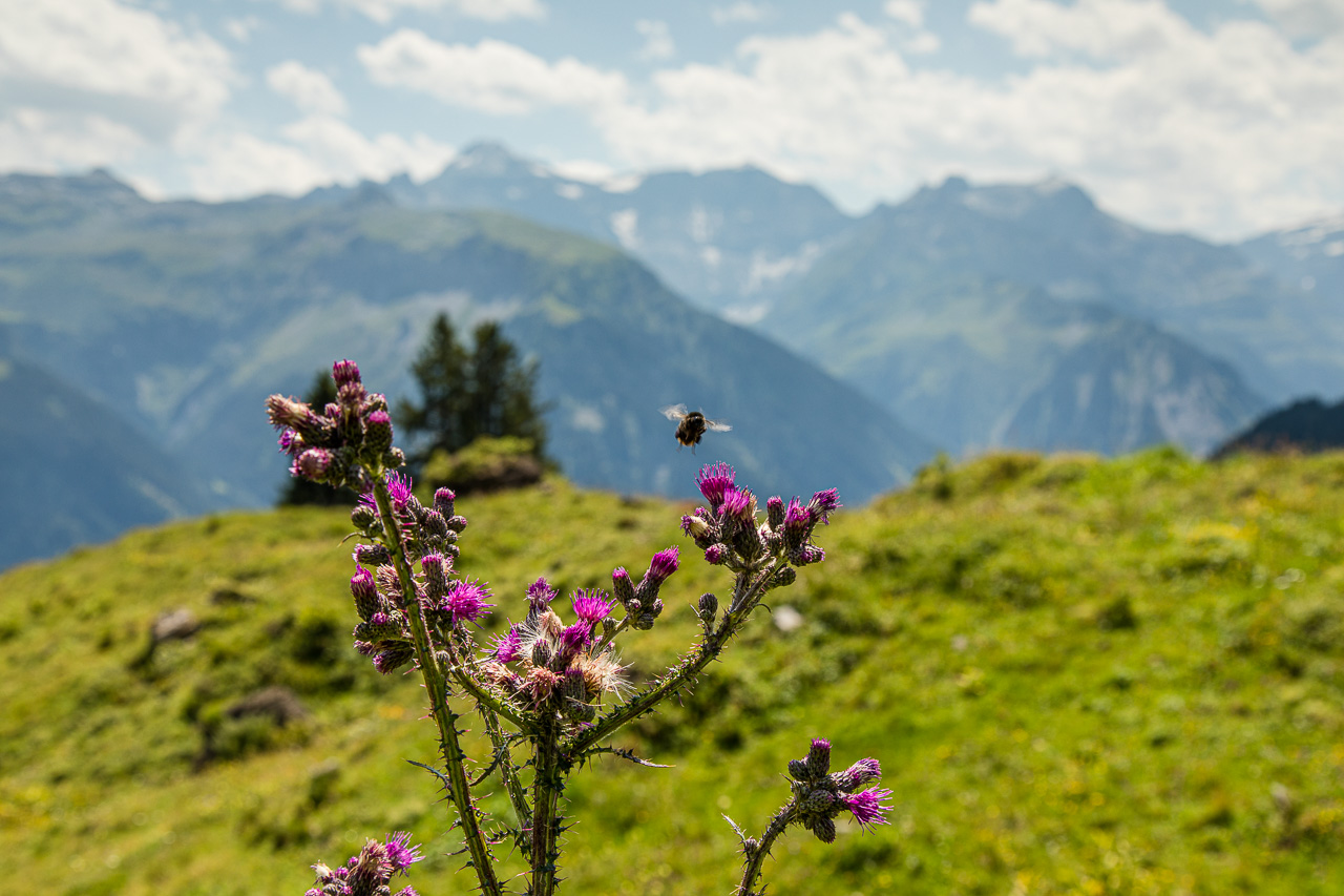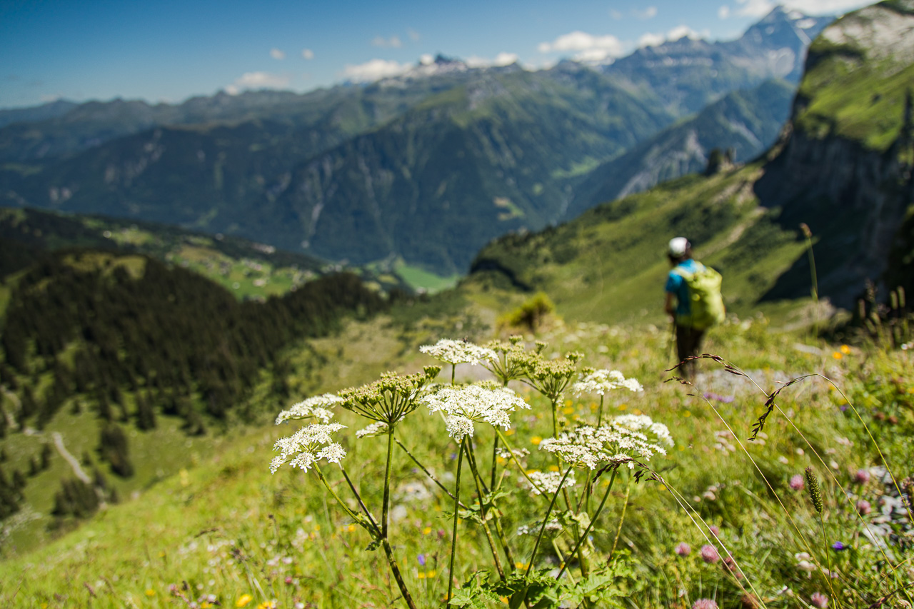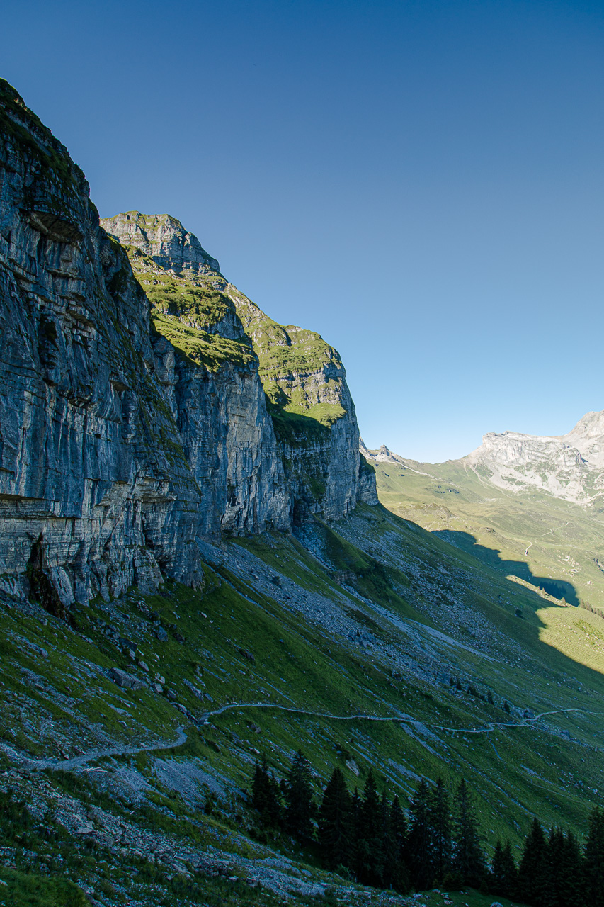 Nun haben wir die Wahl: Nach links auf einem Bergweg nach Gumen und mit der Bahn runter oder direkt via Bärentritt nach Braunwald. Ich habe keine Ahnung, was der Bärentritt ist, aber direkt runter ist sicher schneller. Zu Beginn geht es noch normal abwärts, dann wird es immer steiler, dann kommen Ketten. Wir steigen einfach ab, ohne genauer zu schauen. Wir ahnen, dass es da runter geht, sehen tun wir das aber nicht genau. Irgendwann wird das Gelände flacher und geht in Wiese über. Gemütlich flanieren wir zwischen Blumen, schauen zurück: Wir sind eine fast senkrechte Felswand abgestiegen! Von der Brächalp führt der Weg nochmals steil abwärts, bevor wir Braunwald und unser Hotel erreichen. Zum Glück, unsere Trinkvorräte sind erschöpft und wir haben Durst. Jetzt etwas trinken!