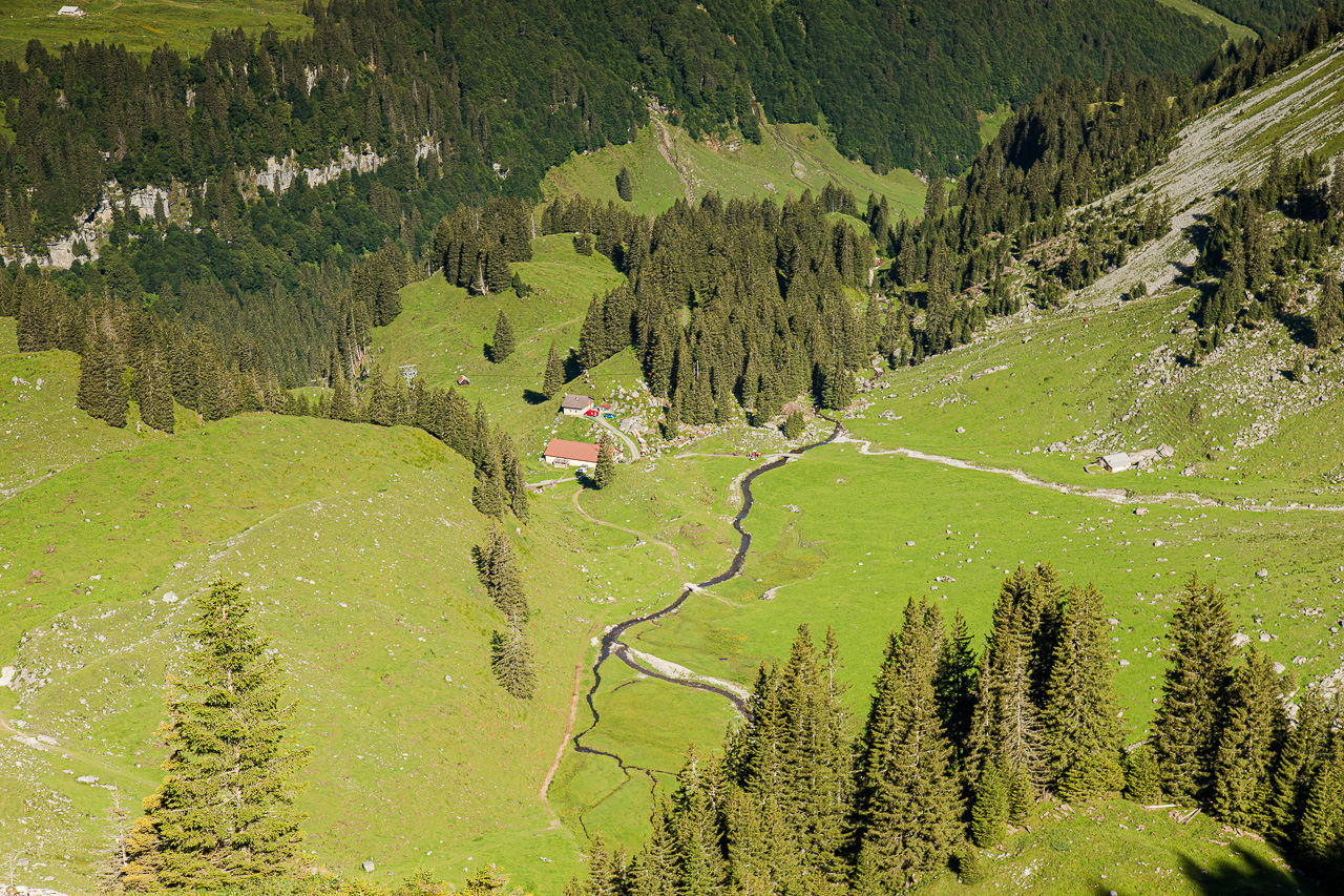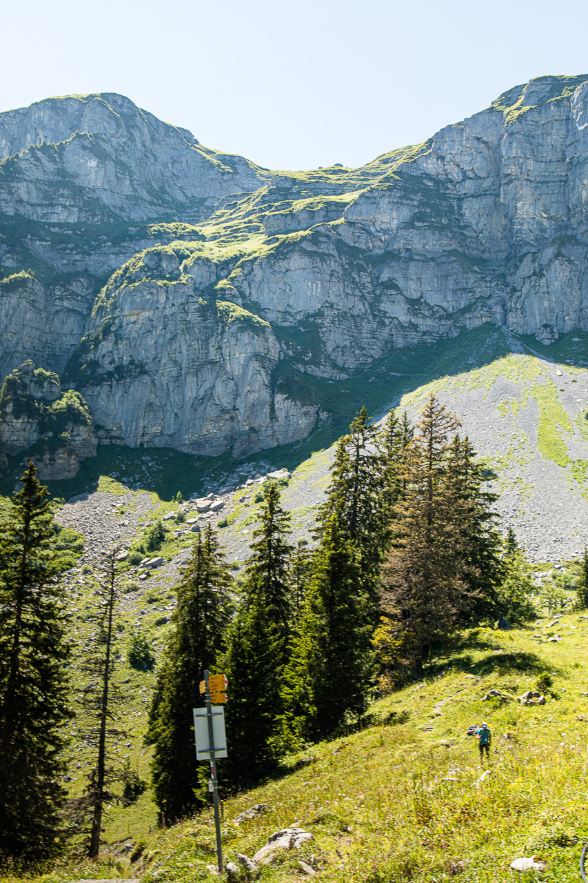 Um acht fährt die erste Bahn hoch zur Glattalp. Um Viertel vor sind wir parat, aber es stehen schon viele Leute an, die Bahn fährt ununterbrochen (es gibt nur eine Gondel). Wir wollen Billette lösen: „Um Viertel vor neun könnt ihr hoch“, also in einer Stunde. Wir schauen uns an, der Entscheid ist klar: Wir wandern hoch. Das dauert zwar doppelt so lang, aber wir hätten einiges verpasst. Und wir geniessen die Kühle des Morgens, denn es soll wieder ein heisser Tag werden. Naturgemäss sind auch viel weniger Leute unterwegs hier. Wenn die wüssten, was sie verpassen!