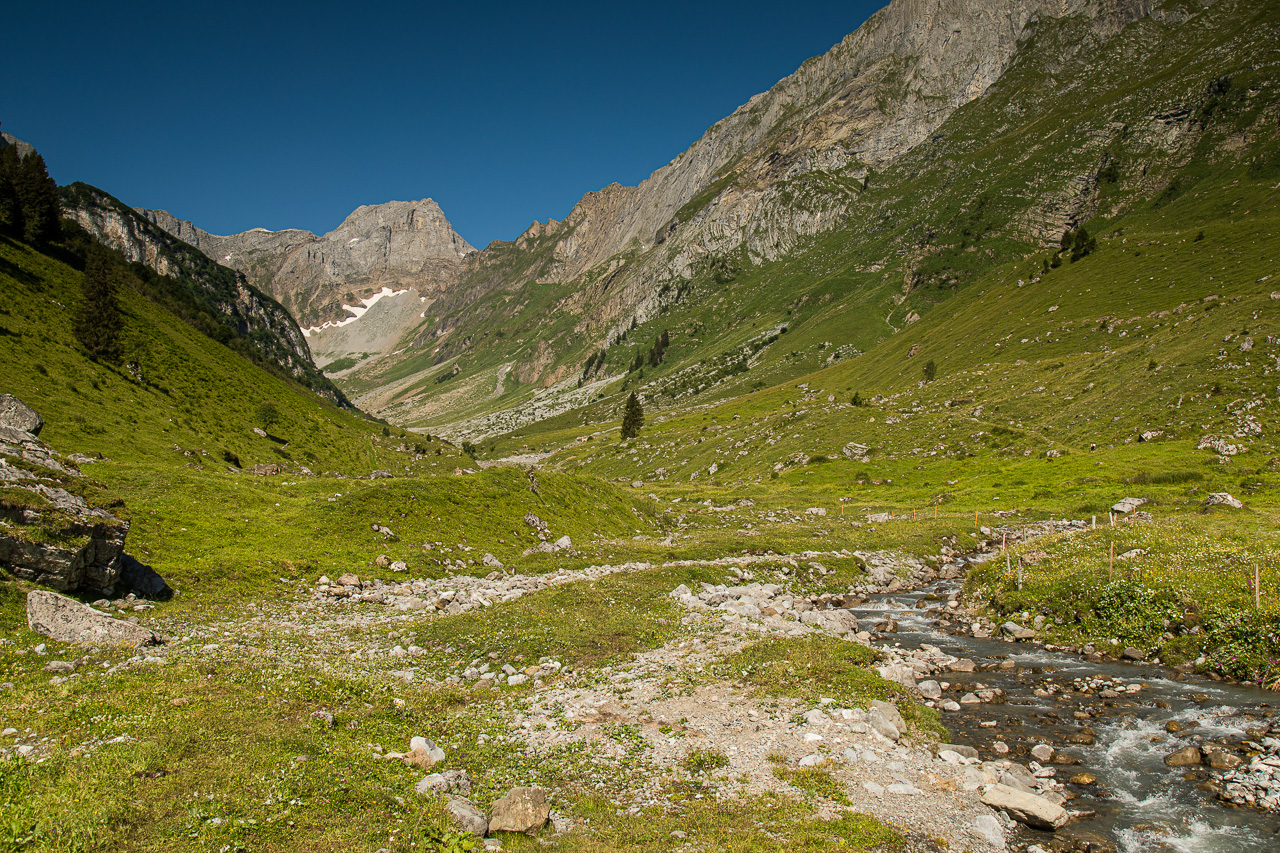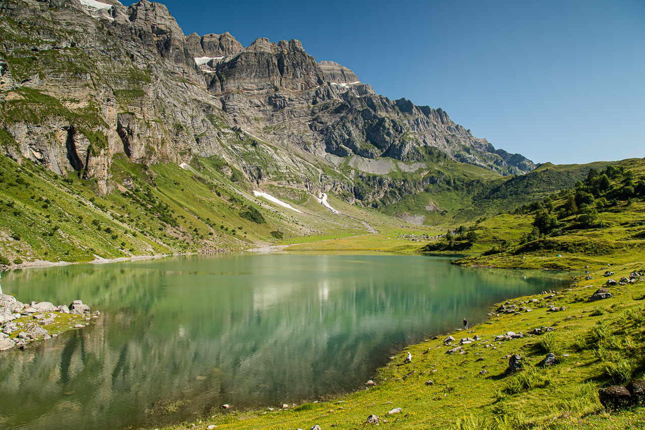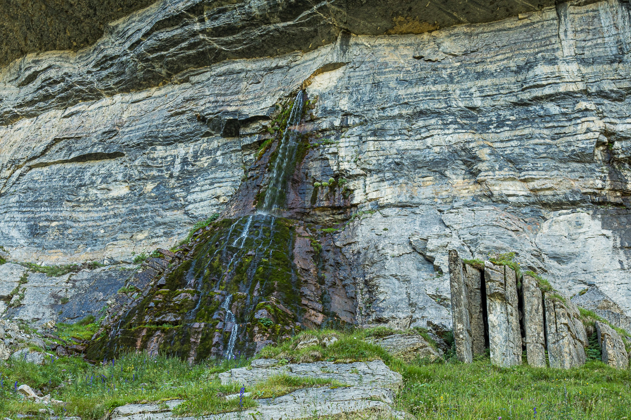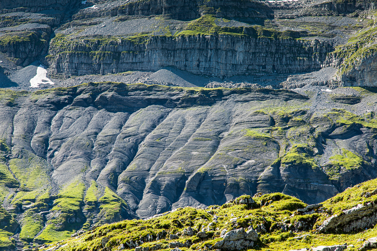 Nach dieser Erfrischung wandern wir weiter, vorbei am Glattalpsee, ebenfalls einem Speichersee wie der Waldisee. Ohne den Kanal, der das Wasser in den See leitet, würde man kaum erkennen, dass es sich um einen künstlichen See handelt. Am Horizont sehen wir die Furggele, den Pass, den wir überqueren müssen nach Braunwald. Rechterhand sehen wir lehrbuchmässig die Gesteinsfaltung. Schon verrückt, wie da während Jahrmillionen einfach Fels gefaltet wird.