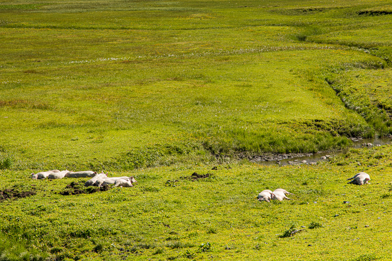 Der Weg wird immer schmaler, ist aber immer gut zu gehen. Nach gut eineinhalb Stunden erreichen wir die Glattalp, eine Hochebene, wo allerlei Vieh weidet. Dort gibt es ein Restaurant, dessen Angebot wir gerne nutzen, denn es ist heiss und durstig. Die Schweine geniessen die Sonne, es scheint ihnen wörtlich sauwohl zu sein.