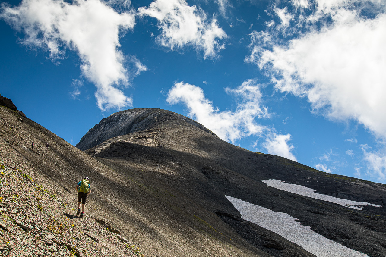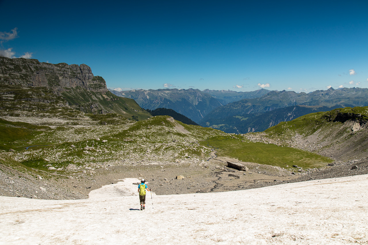 Auf der anderen Seite geht es ebenso steil runter wie vorher hoch, aber der Weg ist nicht so rutschig. Im flacheren Gelände queren wir ein Schneefeld, das hier übersommert. Die folgende grasbewachsene Schwemmebene bietet ein Gehen wie auf Wolken, verglichen mit dem vorherigen Auf- und Abstieg.