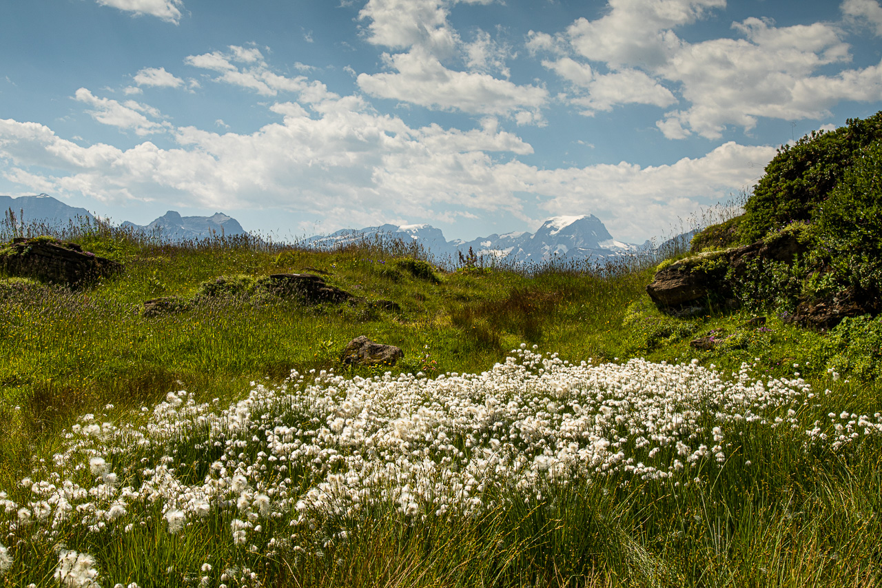 Dann erwischen aber den richtigen Weg und den richtigen Gipfel. Eigentlich ist es nur ein von Heidelbeerstauden gekrönter Hügel, aber die Aussicht ins Glarnerland ist trotzdem schön. Wir kehren wieder zurück auf den Wanderweg und nehmen den „berühmten“ Leuggelenstock in Angriff. Eigentlich ist es eher eine Kuhweide an Hanglage, dafür hat es hier keine Leute. Jetzt sind wir auf dem Gipfel. Nein, doch nicht, dort hinten ist es noch höher. Aber jetzt! Nein, wieder nicht. Es ist aber sehr schön hier, moorig mit Wollgras, Felsen mit Heidelbeerstauden. Schlussendlich finden wir den eigentlichen Gipfel, kein nennenswerter, aber mit viel Aussicht. Und Kühe sind definitiv häufiger hier als Menschen.