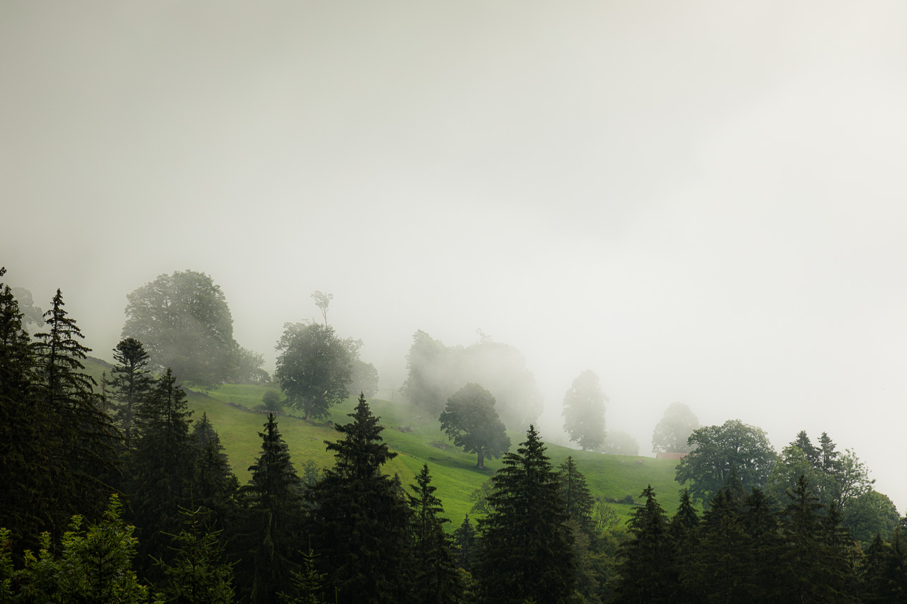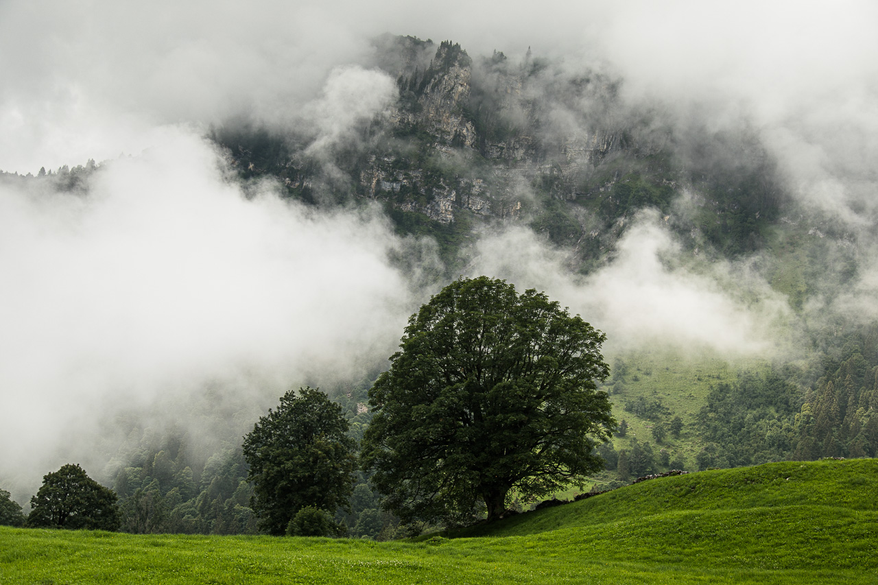 Das erste Ziel ist das Bergrestaurant Nussbühl, erreichbar auf einem einfachen Spaziergang in einer Stunde. Nebelfetzen umwabern die mächtigen Ahornbäume. Diese wären alleine einen Post wert, so faszinierend sind sie. Im Wald kurz vor dem Nussbühl ist die Stimmung geradezu mystisch.