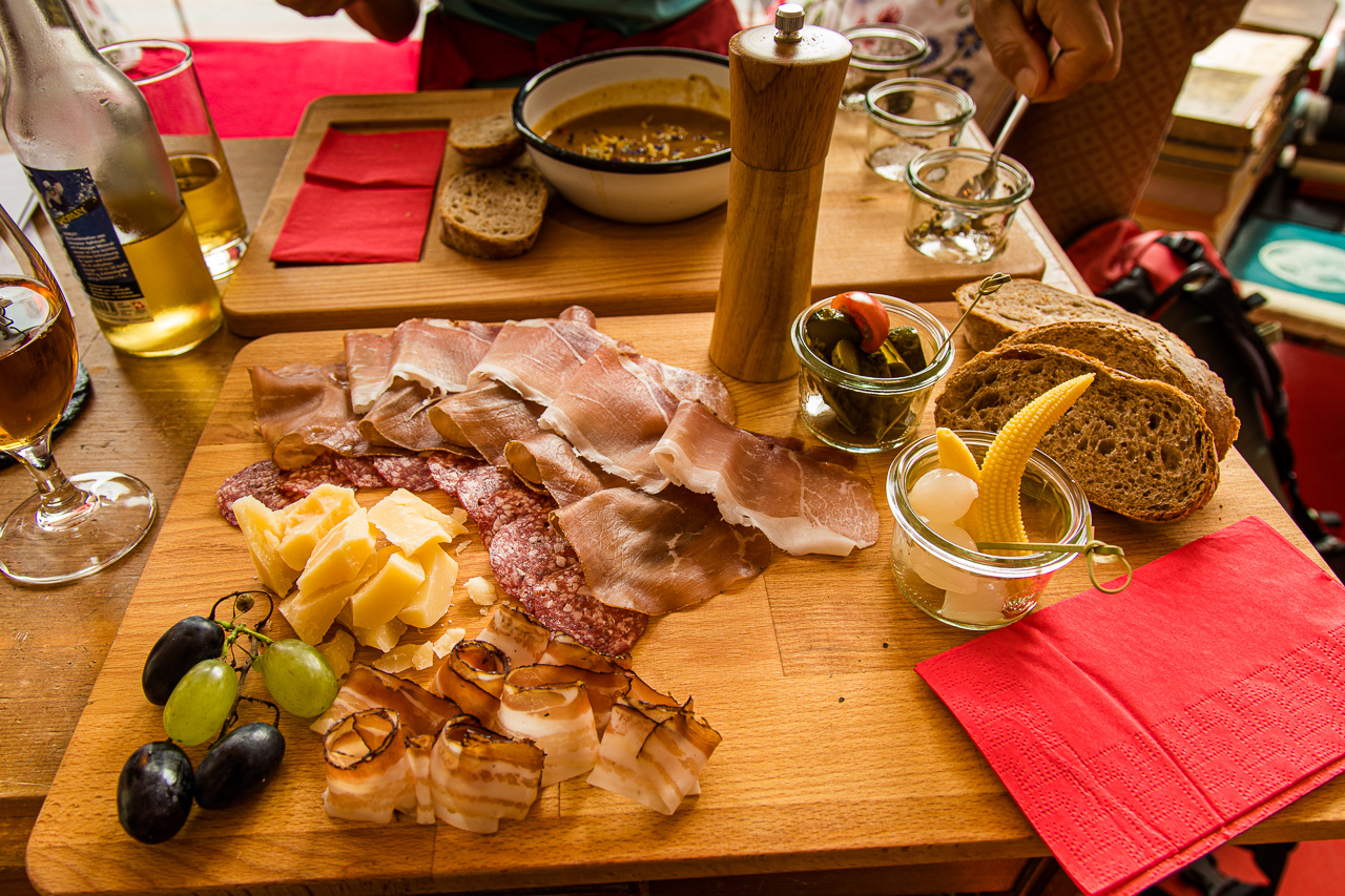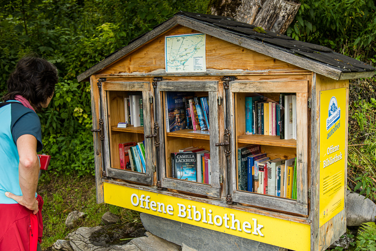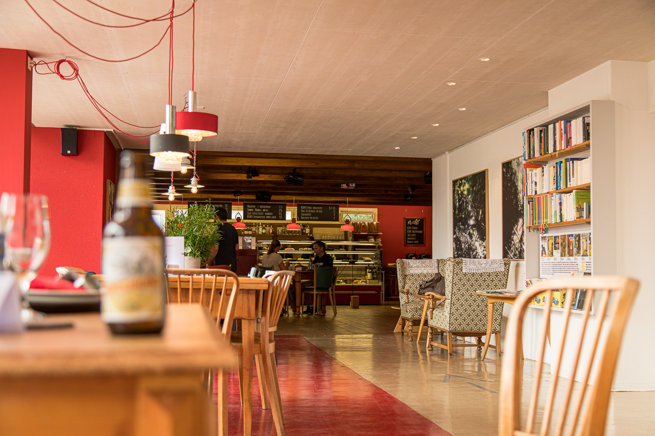 Nach einer Ovo im Nussbühl kehren wir nach Braunwald zurück. Es geht gegen Mittag, der Hunger meldet sich. Wie gut, dass gleich vor uns das „Bsinti“ liegt, Lesecafé und Kulturbar. Man kriegt dort zu Mittag einfache Gerichte. Wie der Name schon sagt, kann man zum Kaffee lesen. Es stehen Bücher zum Ausleihen und zum Kaufen im Regal. Auch Kunst gehört dazu, an den Wänden hängen verfremdete Fotografien. Nun ja, Geschmackssache.