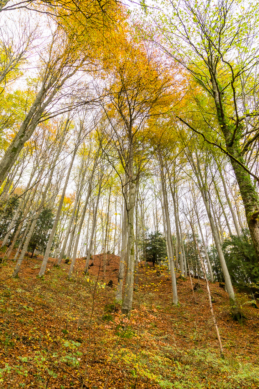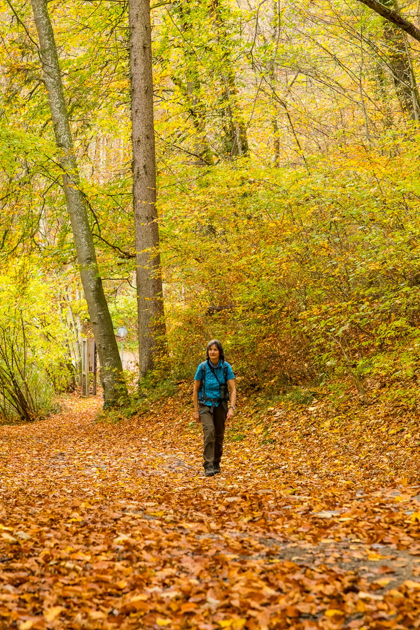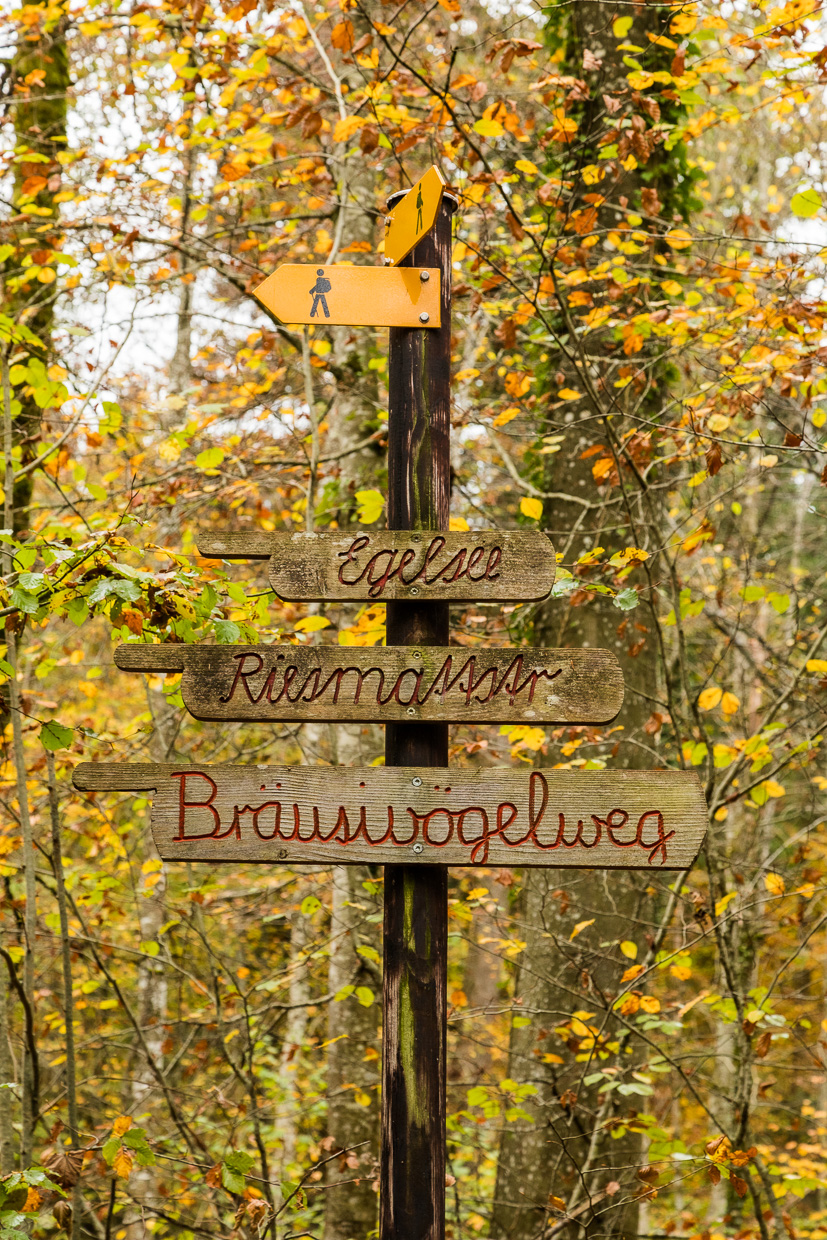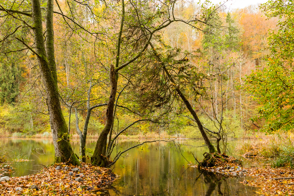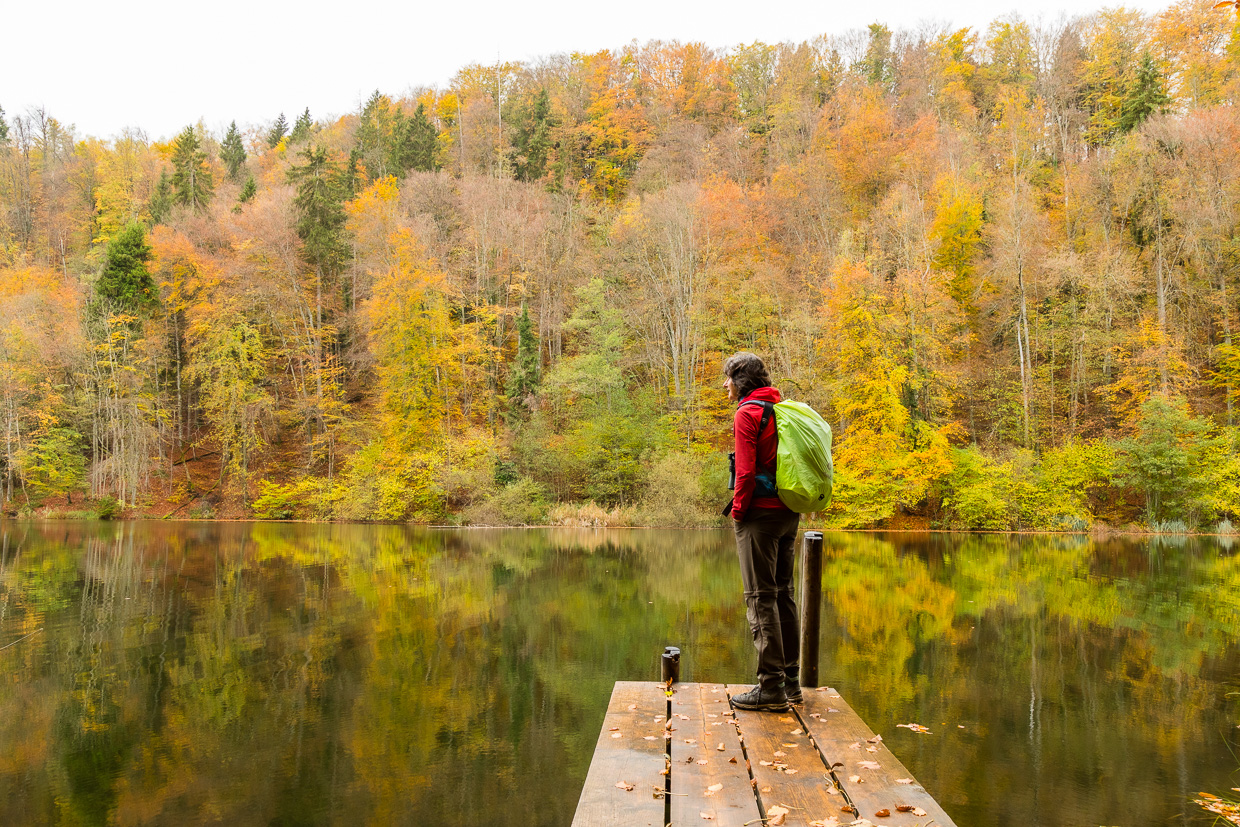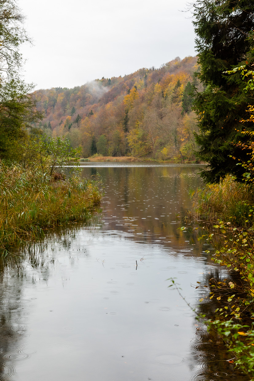 Still ist es, nur das ferne Rauschen der Zivilisation ist vernehmbar. Schon bald erreichen wir den Egelsee, der ruhig in einem kleinen Tälchen liegt. Wir sind immer noch alleine, das Laub ist schön herbstlich gefärbt. Es regnet leicht, wir gehen auf dem braunen Laubteppich. Will man der Sage glauben, war es hier nicht immer so idyllisch.