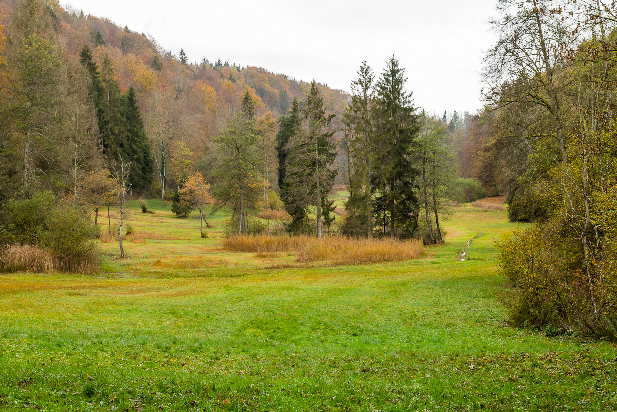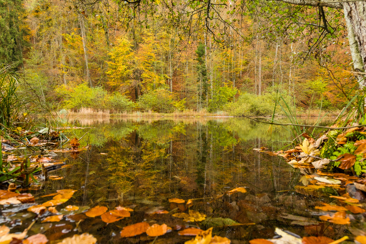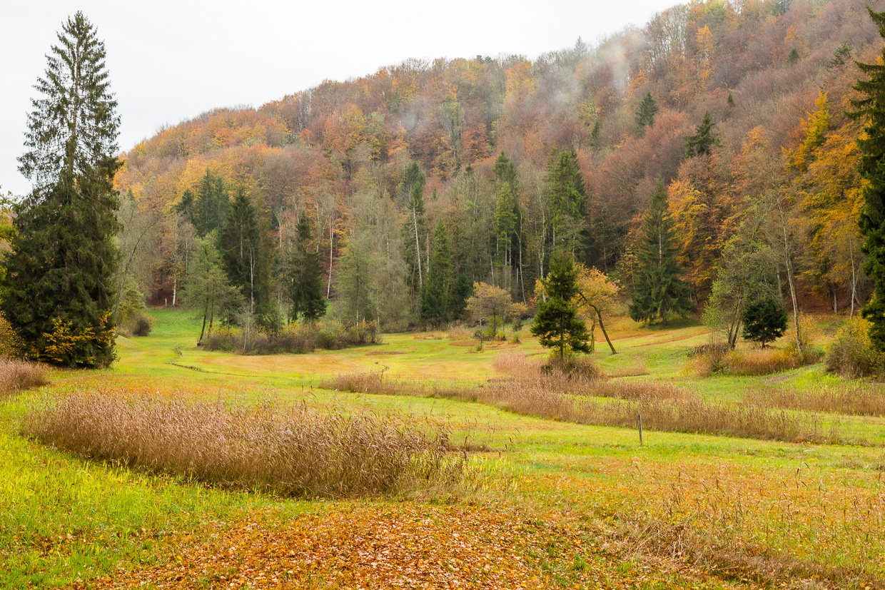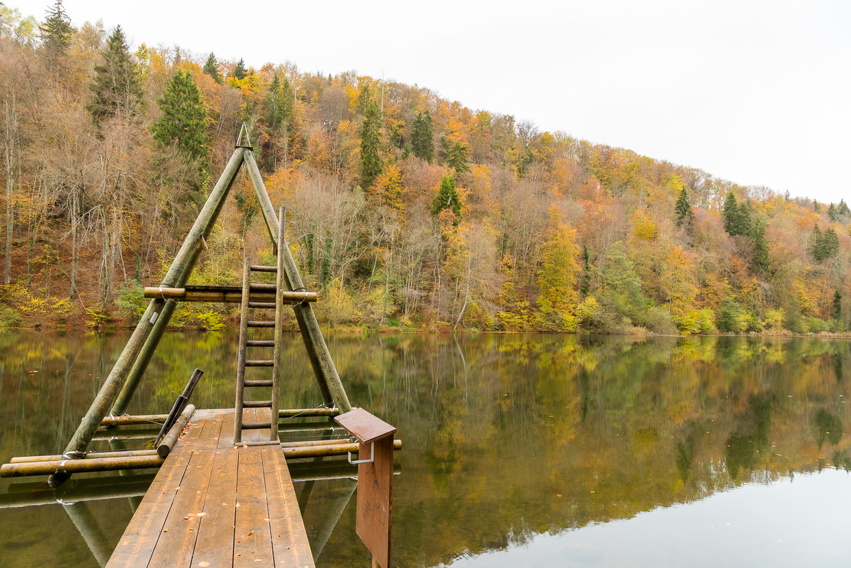 Heute deutet nichts auf Raubritter und Unwetter hin, wir geniessen die Ruhe. An schönen Sommerwochenenden ist es damit nicht weit her, da wimmelt es von Ausflüglern. Am anderen Ende des Sees, dort, wo ein Sprungturm steht, steigen zwei Frauen aus dem See, heute, am 1. November! Uns ist nicht nach baden zumute, wir bewundern den See lieber vom Ufer aus. Am Seeende breitet sich ein Flachmoor aus. Es wäre interessant zu wissen, wie es im Frühling dort aussieht.