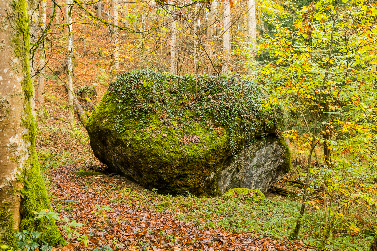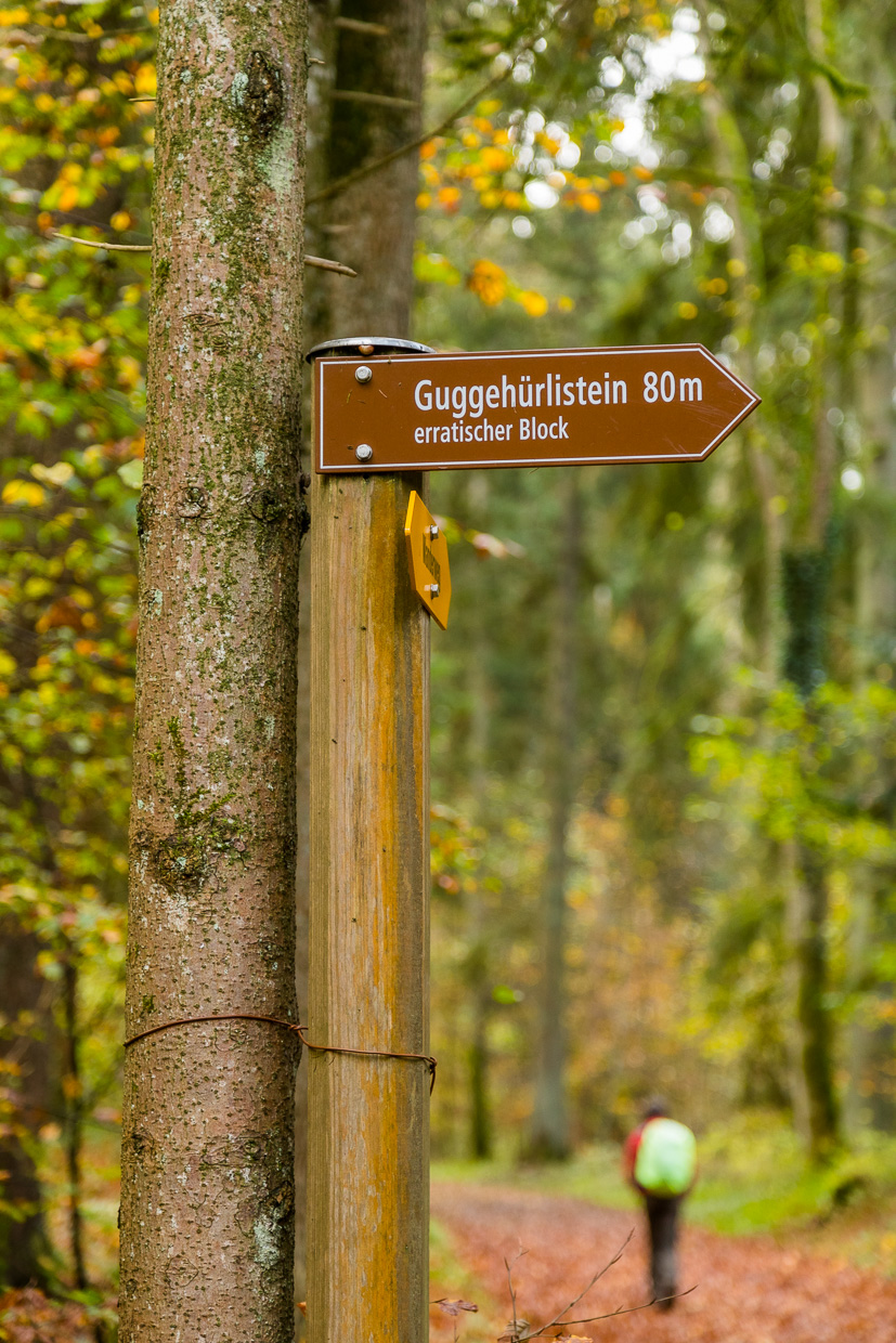 Wir gehen weiter durch den Wald. Das Wetter ist jetzt freundlicher, das Geniesel hat aufgehört. Wir kommen an einen Wegweiser: „Guggehürlistein„. Gwundrig, wie wir sind, folgen wir dem Wegweiser in den Wald. Nach 80 Meter erreichen wir einen riesigen Felsblock, ein Findling, den der Linth-Rheingletscher während der vorletzten Eiszeit hierher transportiert hat.