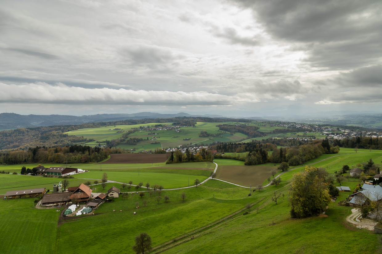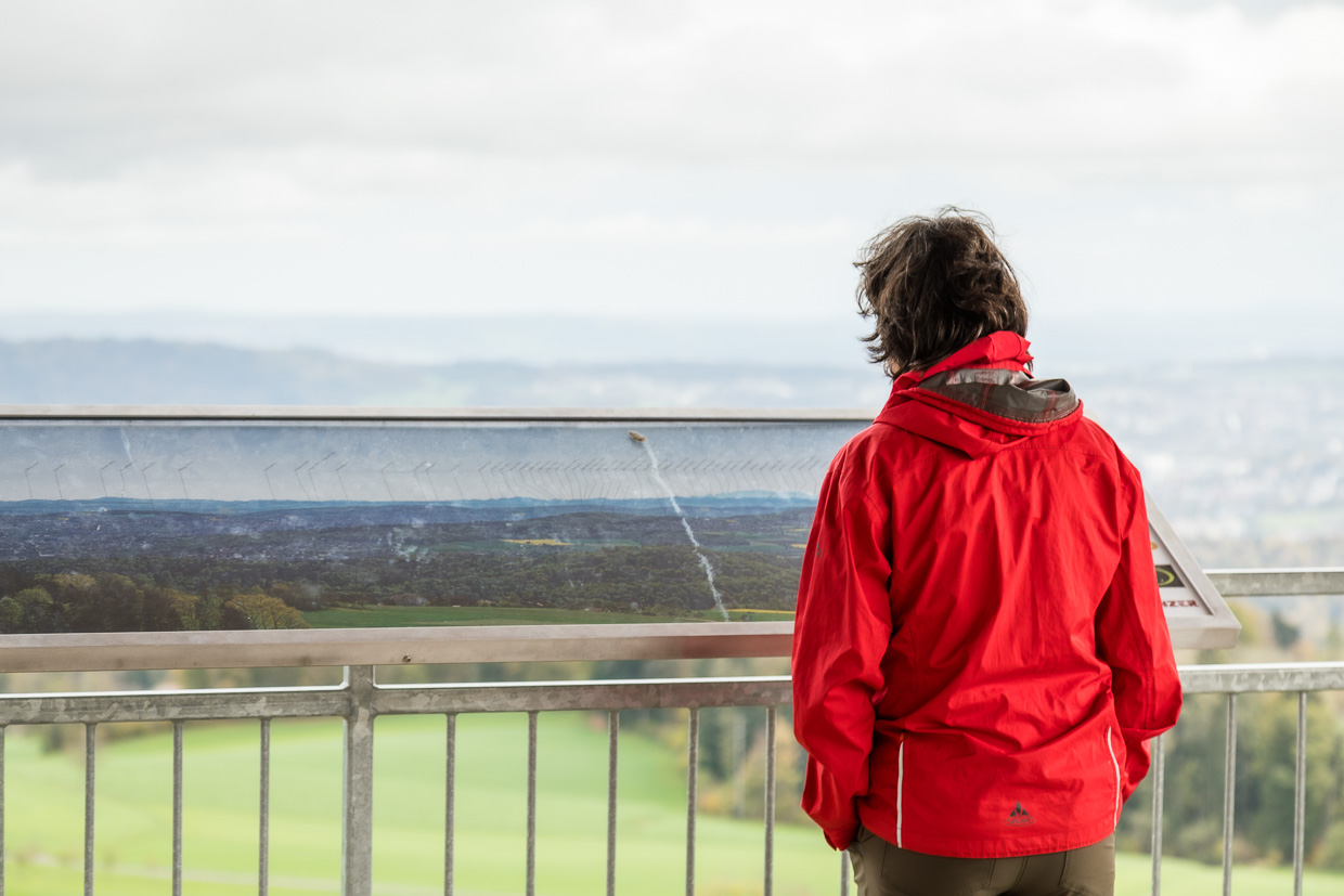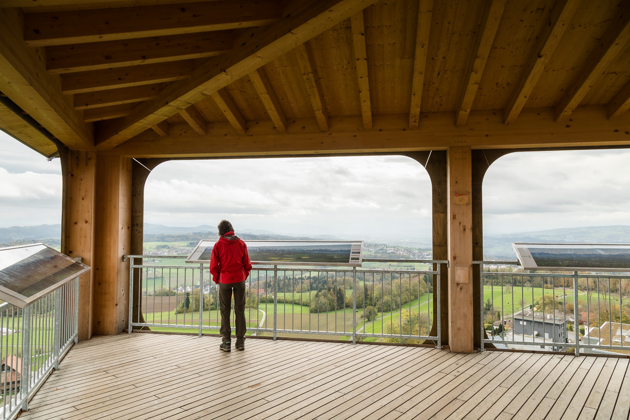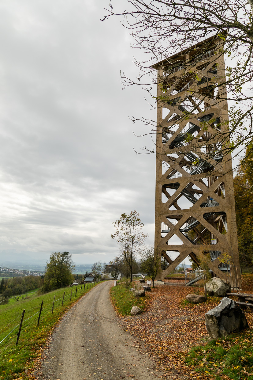 Zur Burgruine Kindhausen könnten wir auch noch einen Abstecher machen, aber wir bevorzugen den direkten Weg zum Hasenbergturm. Er steht an einer Stelle am Waldrand, von wo man auch ohne Turm bereits eine grossartige Aussicht hat. Wir besteigen ihn natürlich trotzdem, 210 Treppenstufen führen uns zur Aussichtsplattform auf 36 Meter Höhe. Vermutlich hätten wir jetzt ein fantastisches Alpenpanorama, leider verhindert der trübe Tag, dass wir überhaupt Berge sehen. Aber auch so geniessen wir die Aussicht.