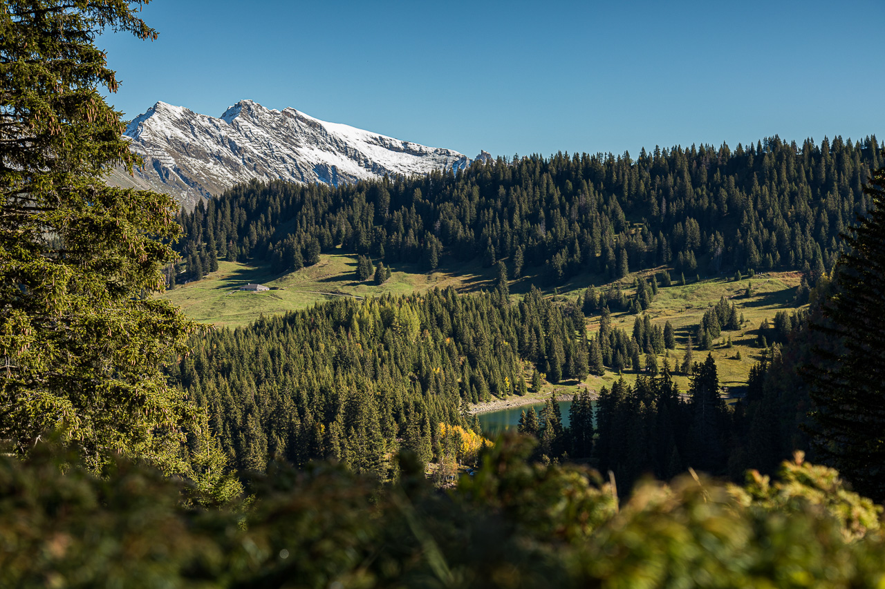 Wir nutzen die Gratisbahn zum Col de Bretaye, der Zug ist nicht mehr so voll wie am Sonntag. Wir steigen erst mal ab zum Lac de Bretaye, wo sich Blässhühner tummeln, was eher selten ist auf dieser Höhe. Weiter abwärts, in den Fichten unterhalb von Crêta, suchen Hauben- und Tannenmeisen nach Fressbarem, ebenso die Eichelhäher, die ihre Wintervorräte anlegen. Der Herbst hinterlässt bereits deutlich seine Spuren, die Blätter verfärben sich schnell.