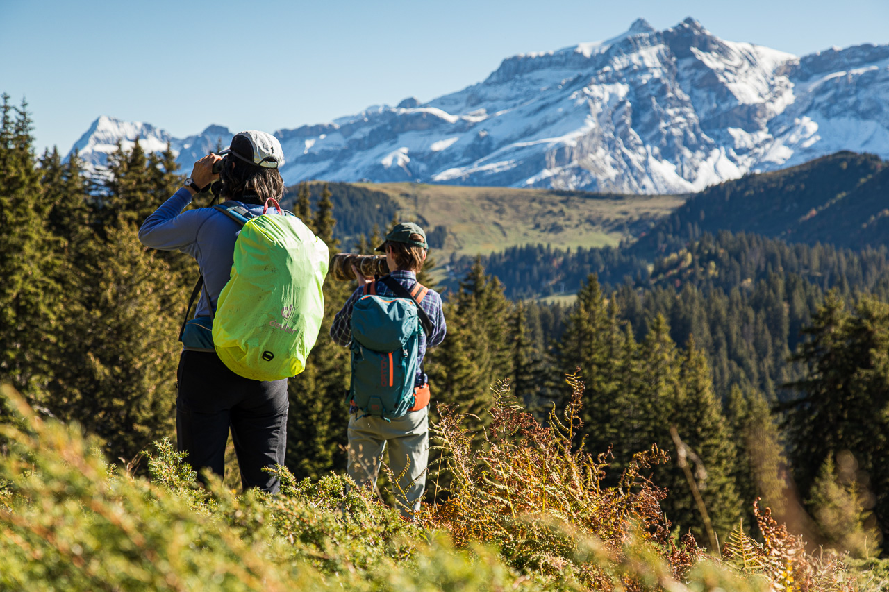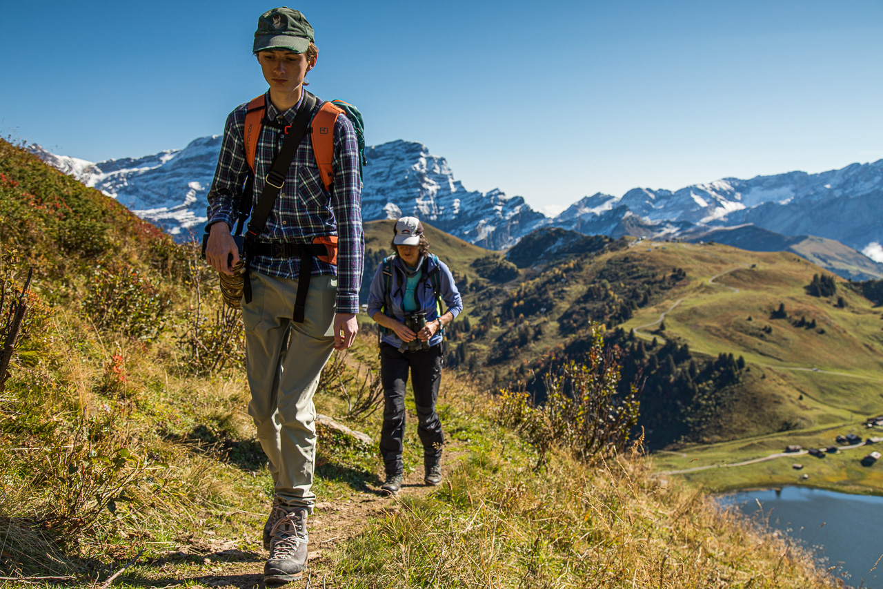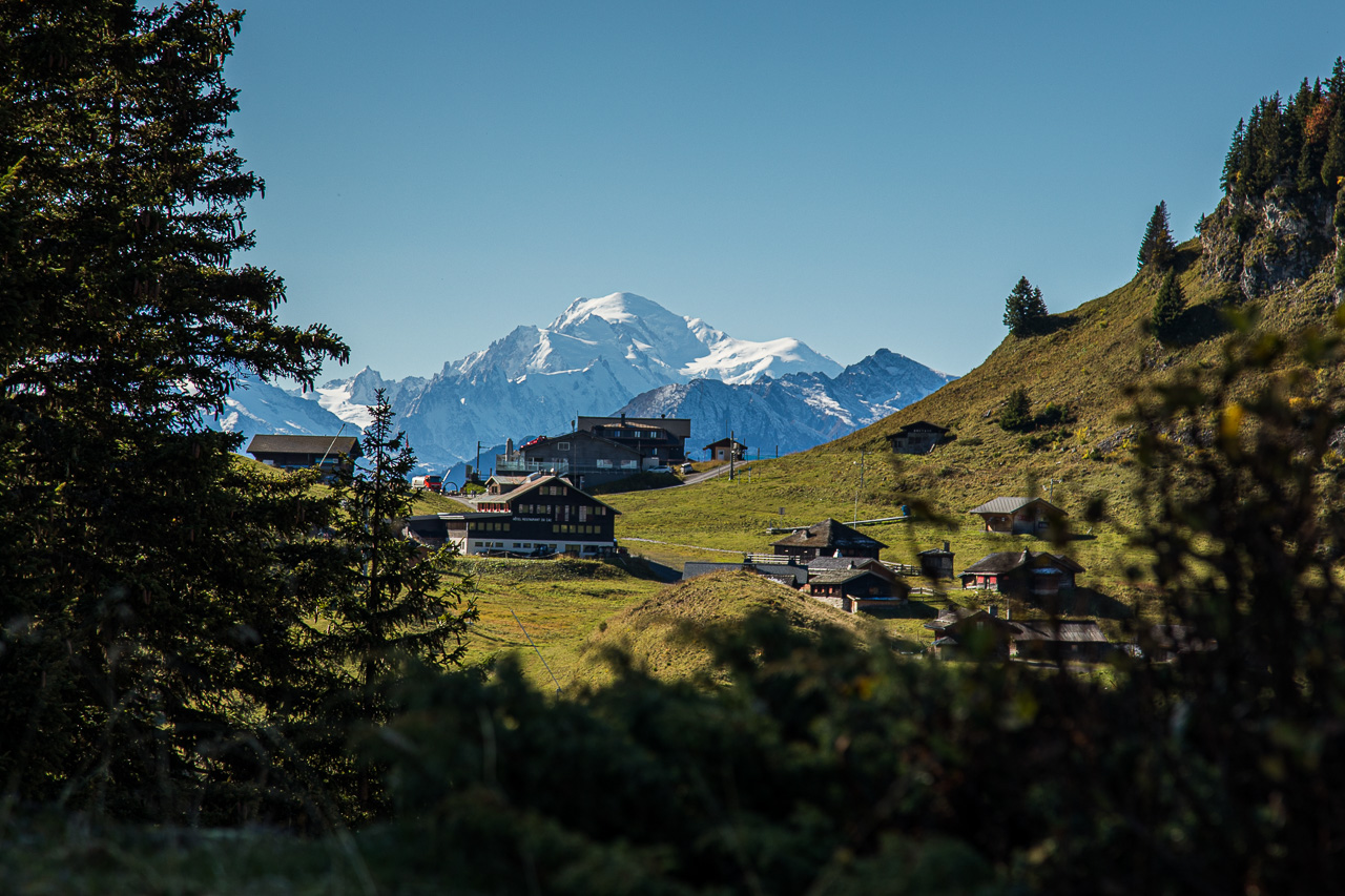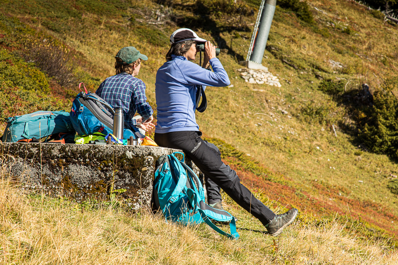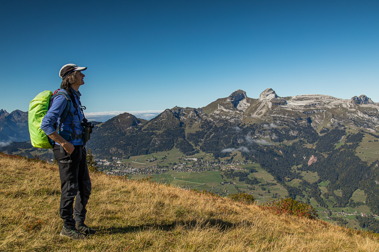 Wir verlassen die Alpstrasse und zweigen unter dem Lift auf den Petit Chamossaire links ab. Ein steiler Bergwanderweg führt uns nun schnell in die Höhe. Viele Hausrotschwänze tummeln sich noch hier, wir geniessen den blauen Himmel und die gute Fernsicht, man sieht neben vielen anderen den Mont Blanc. Plötzlich ein „Pssst!“: Silvan deutet mir in den Wald. Jetzt höre ich sie auch: Es ist Herbstbalz bei den Birkhähnen! Ihr gurren ist deutlich vernehmbar.