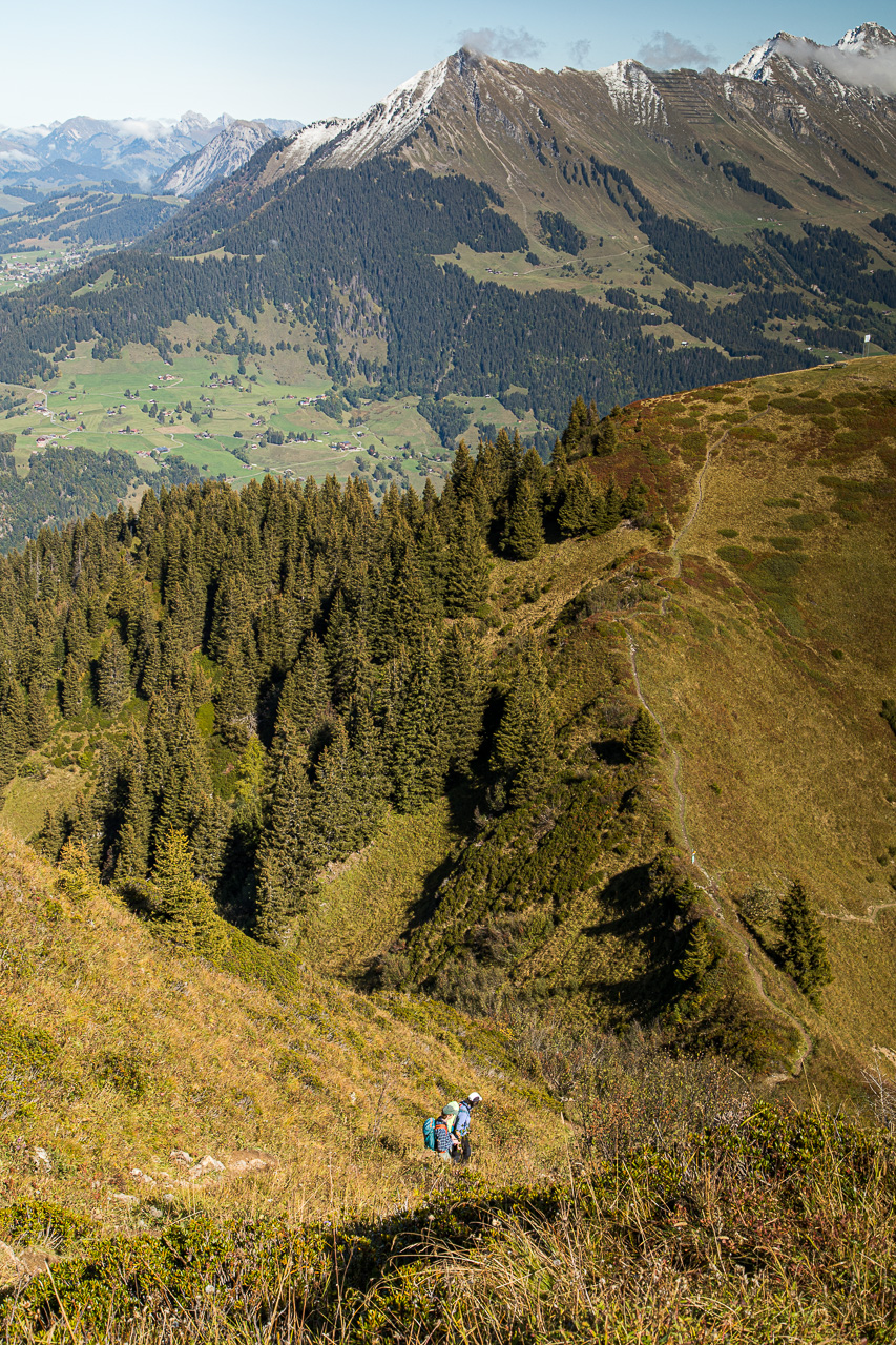 Nachdem wir uns satt gesehen haben, kehren wir wieder zurück zu Pt. 2009 und wandern einen steilen Weg hoch zum Chamossaire, dem Hauptgipfel. Der Weg ist ziemlich schmal und zeitweise steil abfallend gegen Westen, Trittsicherheit ist da gefragt. Weit unten liegt der Lac de Bretaye in die herbstliche Landschaft eingebettet, die Blässhühner hört man aber bis hier hinauf. Die letzten Meter zum Gipfel sind dann eher so betreutes Wandern mit Absperrungen, Warnungen und plattgewalzten Wegen. Das ändert nichts an der Tatsache, dass die Aussicht umwerfend ist, auf der einen Seite sehen wir den Genfersee, auf der anderen die Walliser und Berner Alpen. Silvan verzichtet auf den Gipfel, die Erkältung plagt ihn immer noch.