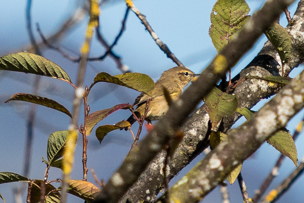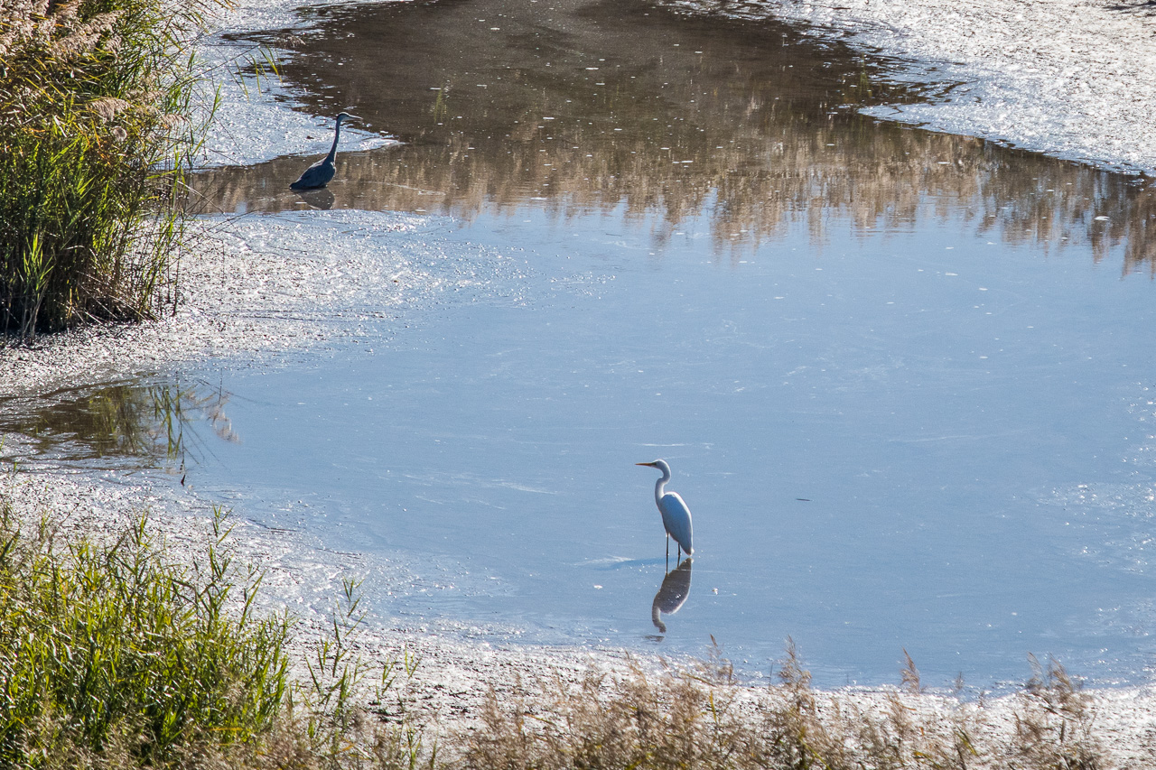 Wir gehen zum nächsten Beobachtungsturm einen See weiter. Als wir die Plattform erreichen, schleicht sich gerade ein Fuchs davon. Im Wasser weit hinten stehen mehrere Graureiher. Im Geäst vor uns hüpft ein kleiner Vogel umher auf der Suche nach Nahrung. Er ist einer dieser olivgrünen Vögel, die alle gleich aussehen, also aus der Familie der Laubsänger. Da wir schon einen Zilpzalp gehört haben, nehmen wir an, dass es sich um einen solchen handelt.